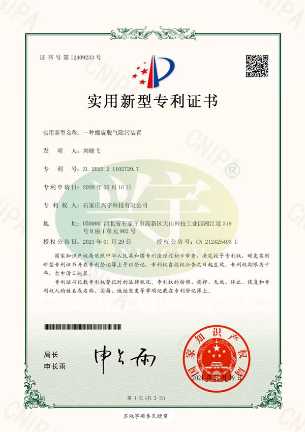 熱烈慶祝興宇科技生產的螺旋脫氣除污裝置獲得新型專利證書